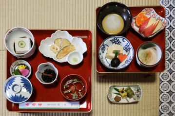 写真の御膳は宿泊料金12,000円(税抜)の場合の夕食例です。(1名様用)